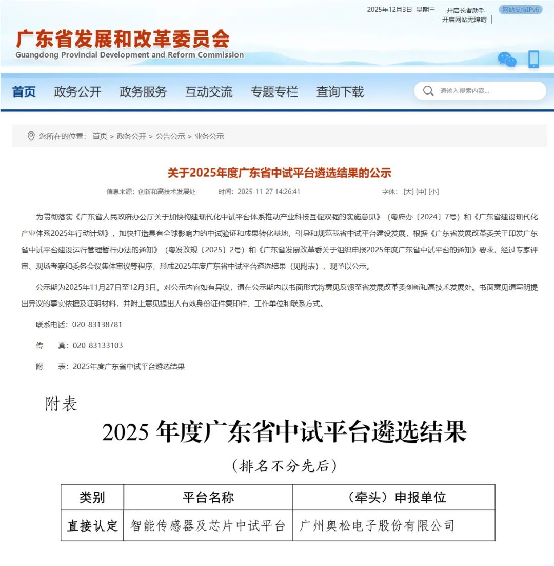 近日,廣東省發展和改革委員會公示了《2025年度廣東省中試平臺遴選結果》。依托廣州奧松電子股份有限公司建設的“智能傳感器及芯片中試平臺”被直接認定為半導體與集成電路類別的廣東省中試平臺。